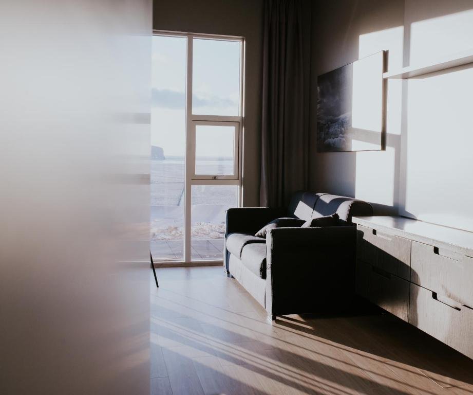 The other highlights of the apartment are a private patio with unforgettable scenery, facing the Dyrhólaey cliffs and ocean shore.