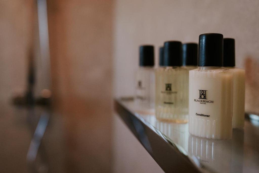 The bathroom consists of a set of towels, branded soaps, and hair products as well as a hairdryer.
