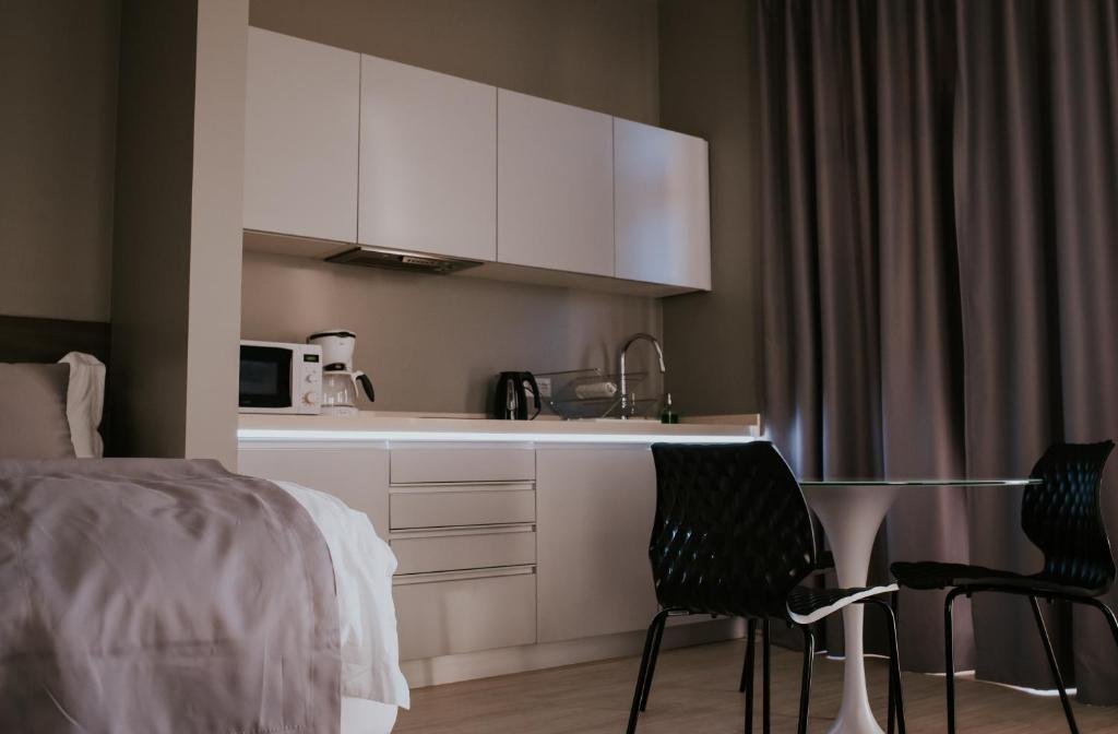 The apartment includes a private bathroom, a fully equipped kitchenette with a small dining area, a large wardrobe with hangers, and a chest of drawers.