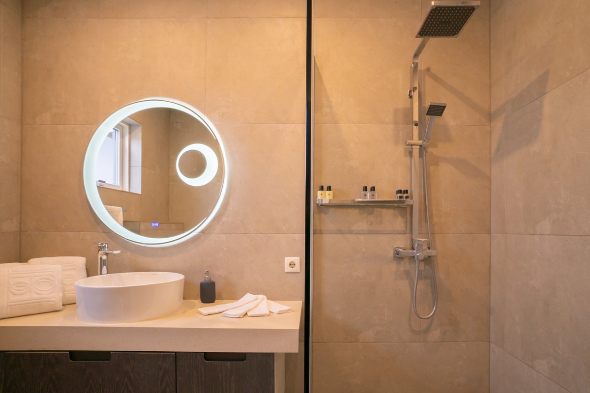 The standard modern studio apartments reflect Scandinavian design, combining simplicity, comfort, and a strong connection to nature. Large windows frame sweeping views, while clean lines and warm materials create a calm atmosphere. Each space is thoughtfully equipped with underfloor heating, a walk-in shower, and quality beds with crisp linen.